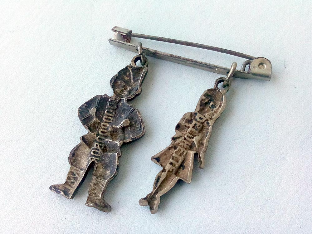 Broche "fétiche" vendue comme porte-bonheur dont les deux figurines indépendantes sont montées sur une broche au revers de laquelle est fixée l'aiguille d'attache.