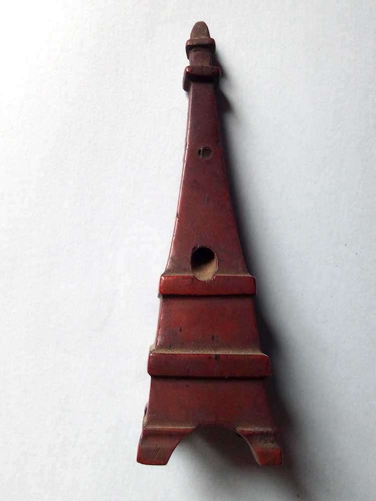 A Victorian cherry wood carved Eiffel Tower souvenir stanhope.